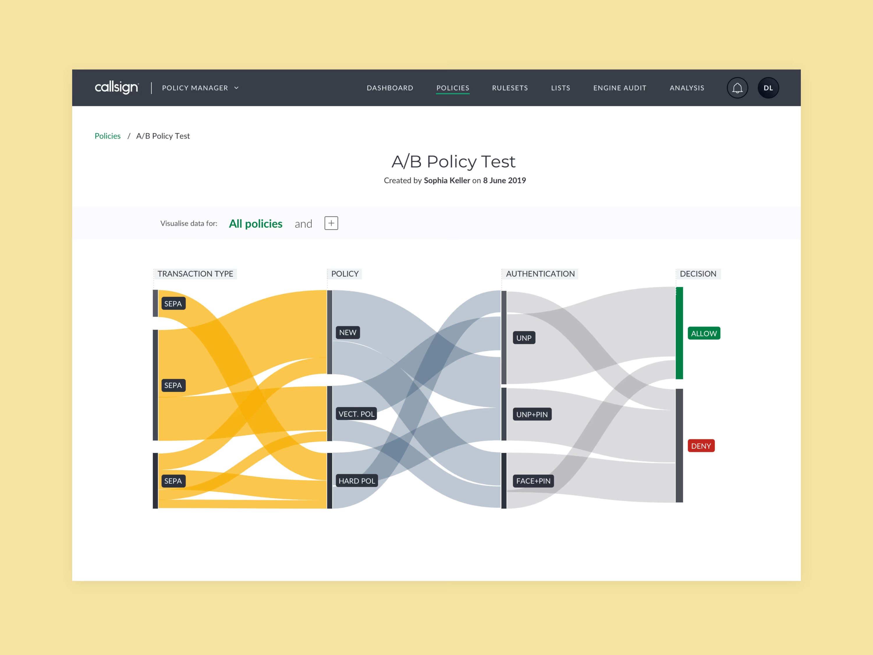 Complementing this, the A/B Policy Test dashboard lets analysts visualise how different rule sets perform across transaction types and authentication methods. By mapping policies to their outcomes, it reveals patterns in approval and rejection rates and supports faster, data-driven refinement of risk strategies. Together, these tools combine simplicity with analytical depth — helping teams design, test, and optimise authentication workflows with confidence and precision.